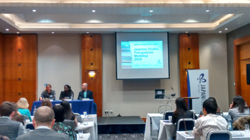 Responding to feedback received during last year’s event which identified securing postdoctoral positions as a key challenge for emerging researchers, this year’s workshop introduced a panel session featuring three early career researchers and lecturers in Japanese studies who were able to offer career advice from recent experience. Dr Jonathan Service (University of Oxford), Dr Gitte Marianne Hansen (Newcastle University) and Dr Ruselle Meade (Cardiff University) each introduced their individual career paths, and then took questions from the audience in an interactive panel discussion. Dr Hansen and Dr Meade had participated in our very first post-graduate workshop as PhD students in 2012, and it was inspiring to have them participate four years later as established lecturers!