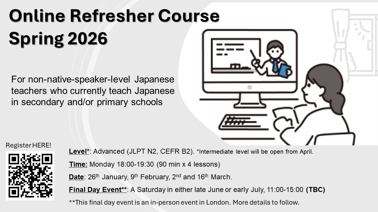 N.B. The course will take place online, but on the final day of the course we would like to hold a special face-to-face session, with special speakers, and there will be a commendation ceremony. The Japan Foundation, London will provide lunch and cover your travel expense partly for the participants of the online sessions*.