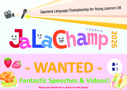 JaLaChamp, or Japanese Language Championship for Young Learners UK, is a contest for primary and secondary school students studying Japanese. There are two categories - the Speech Category, where students give a speech on a theme of their choice, and the Video Category where students are asked to create an original video based on a set theme either by individual or part of a group.