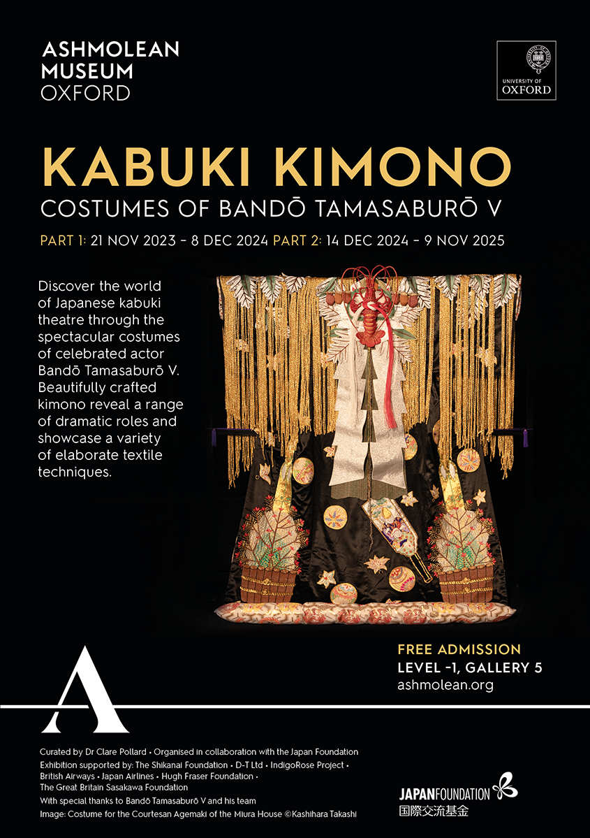 Step into the world of Kabuki with six stunning kimonos worn by the legendary actor BANDO Tamasaburo V, known for his renowned onnagata roles (male actor who performs female roles). Experience the intricate artistry of these garments, highlighting a diverse range of complex textile techniques, encompassing weaving, dyeing, embroidery, and hand-painting. We are delighted to collaborate with the Ashmolean Museum.